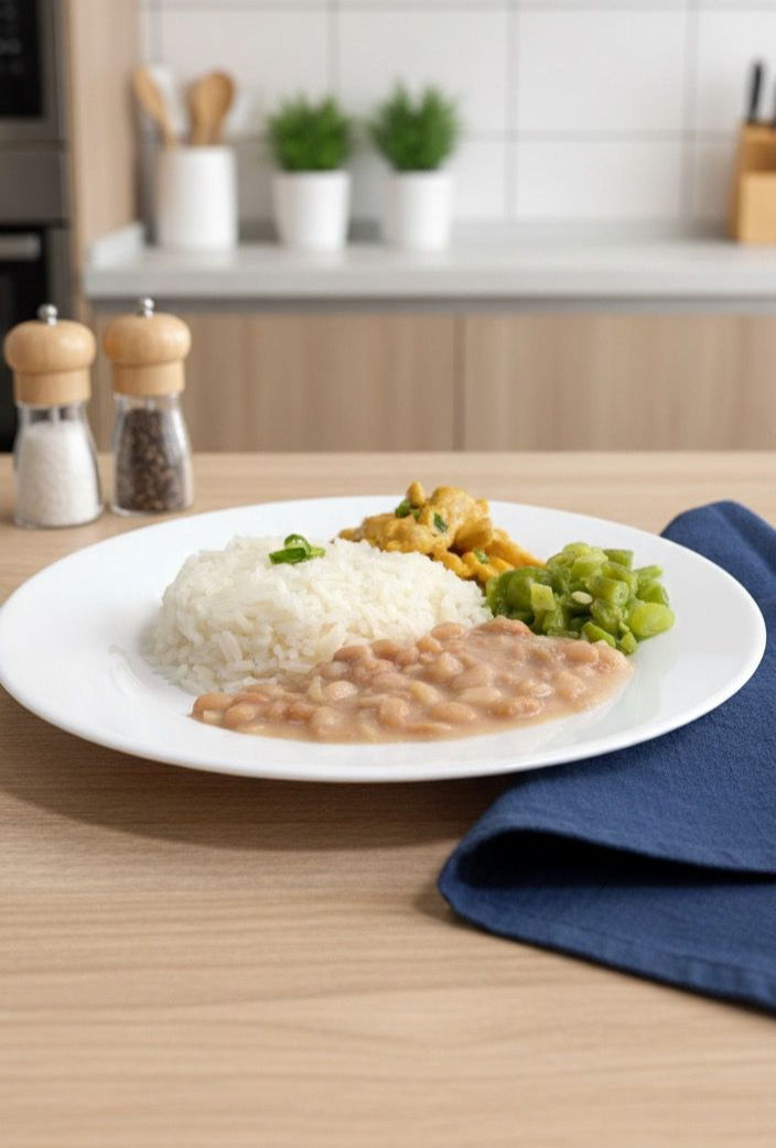 Frango ensopado com hambúguer vegetariano